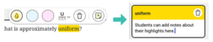 Highlights & Notes: In the top right corner of the screen, students can choose “Highlights & Notes.” When they drag their cursor across a word or phrase, it will highlight the text in yellow, blue, or pink. They can also underline any word or phrase. There is a trash can icon that will remove any unintended highlights or underlines. In addition, students can choose to add a note to the side.